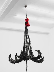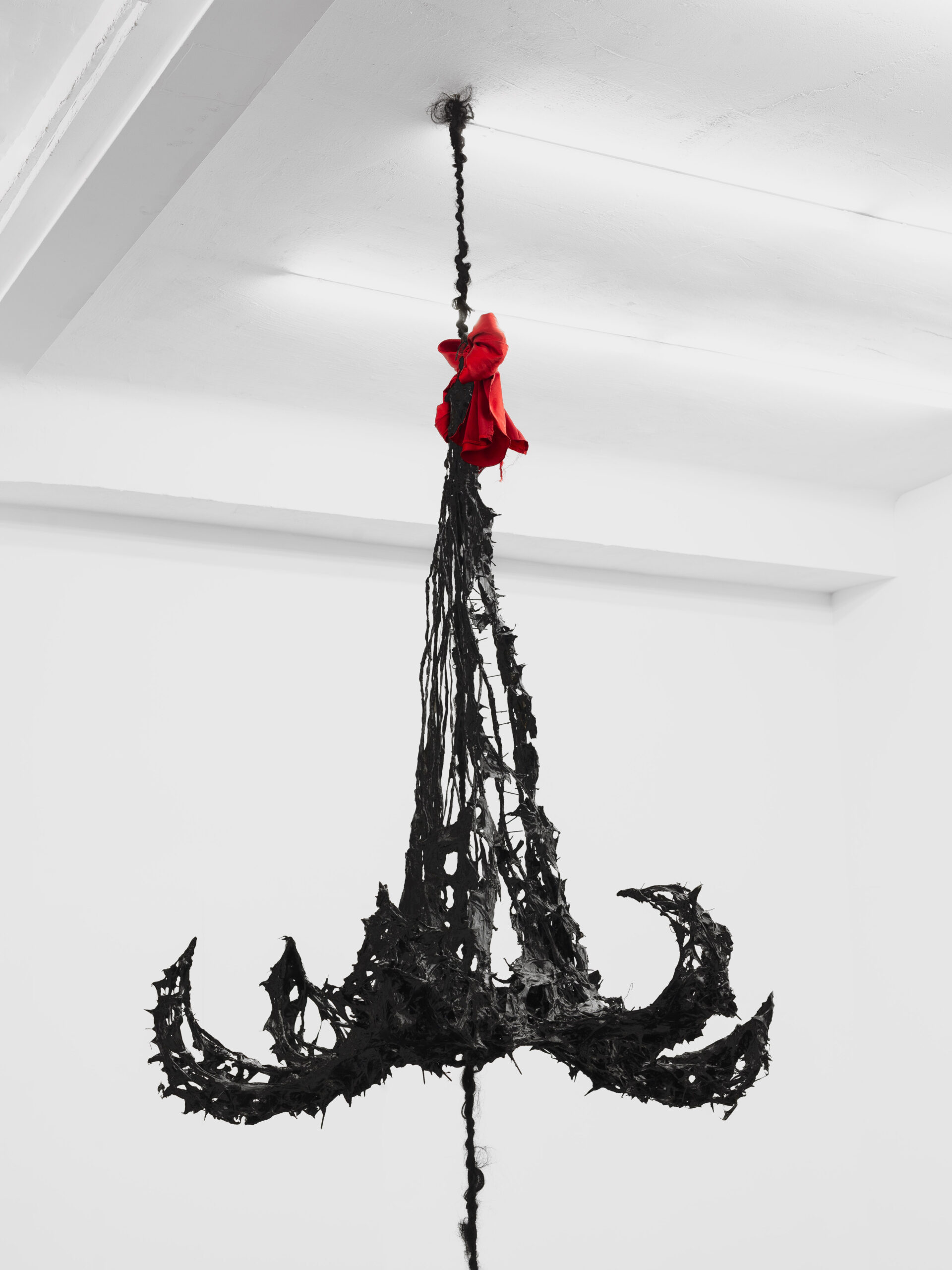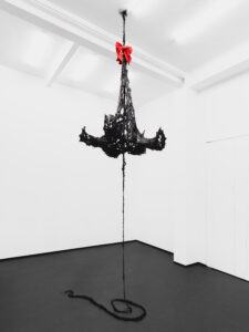 Suspended mid-air, NIGHTMARE BELL is a haunting, gothic structure fashioned from body bags, twisted metal, and synthetic hair. Evoking the silhouette of a monumental bell or broken chandelier, the sculpture hangs with quiet menace—its form both ornamental and ominous, like a ritual object severed from its original meaning. A crimson bow crowns the piece, adding a disturbing note of festive excess to an otherwise funereal presence.
